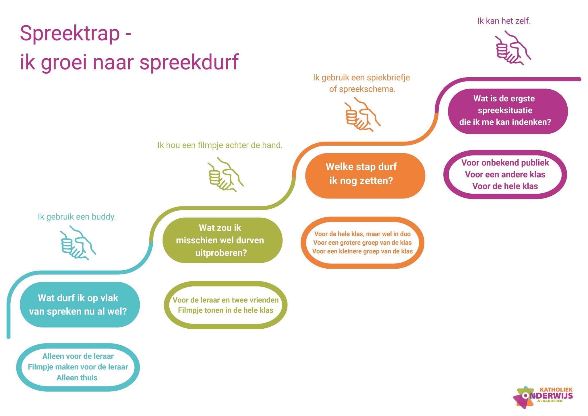 De spreektrap is een visuele voorstelling van de stappen die leerlingen kunnen zetten om te groeien in spreekdurf. Je kan de spreektrap bijvoorbeeld gebruiken om te differentiëren en met leerlingen met spreekangst af te spreken op welk niveau ze een bepaalde spreekopdracht kunnen aanpakken. Bij volgende opdrachten kan de leerlingen dan telkens naar een hogere trede springen.